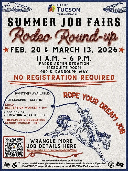 Tucson Parks and Recreation will host Rodeo Roundup Summer Job Fairs on Friday, Feb. 20, and Friday, March 13, from 11 a.m. to 6 p.m. at the Parks and Recreation Administration building, 900 S. Randolph Way.